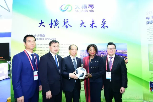 (圖:中國(guó)足協(xié)常務(wù)副主席兼秘書長(zhǎng)張劍(中),國(guó)際足聯(lián)秘書長(zhǎng)法瑪特(右2),市委常委郭才武(左2)親臨大橫琴展臺(tái)視察指導(dǎo)。)