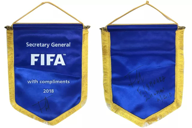 (圖:國(guó)際足聯(lián)秘書長(zhǎng)法特瑪·薩姆拉贈(zèng)送親筆簽名的國(guó)際足聯(lián)會(huì)旗)