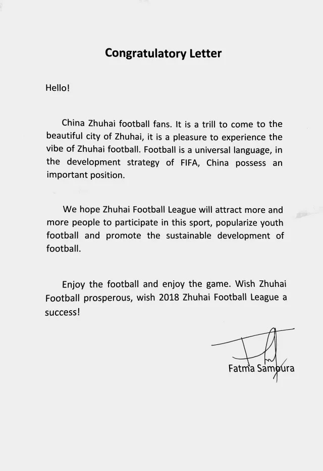 2018珠海市足球聯(lián)賽得到了各方面的關(guān)心和支持,包括國(guó)際足聯(lián)秘書長(zhǎng)法特瑪·薩姆拉和Soccerex主席托尼·馬丁等國(guó)際足壇巨擘,親自為珠海市足球聯(lián)賽發(fā)來(lái)了賀信。