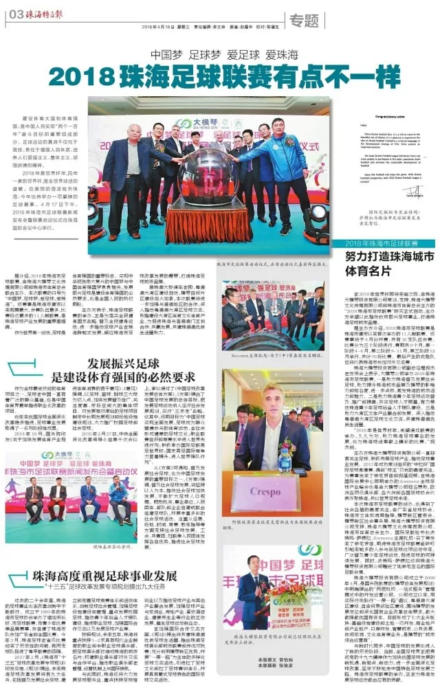 2018年是世界杯年,四年一度的世界杯,是全世界球迷的盛宴。在美麗的海濱城市珠海,今年也將舉辦一項(xiàng)重磅的足球賽事。4月17日下午,由珠海大橫琴投資有限公司策劃、支持,珠海大橫琴文化傳媒有限公司和珠海市體育總會(huì)主辦的“2018珠海市足球聯(lián)賽”昨天正式啟動(dòng),希望以此推動(dòng)珠海市足球事業(yè)發(fā)展,打造珠海足球城市品牌。soccerex主席托尼·馬丁,阿根廷前國(guó)家隊(duì)隊(duì)員、傳奇球星克雷斯波,廣東省足球協(xié)會(huì)副主席、廣東足球運(yùn)動(dòng)中心主任程志文,廣東省政協(xié)委員、澳門中華總商會(huì)青年委員會(huì)主任馬志達(dá),珠海市文化體育旅游局副局長(zhǎng)鄔向明等出席了發(fā)布會(huì)并共同見證了聯(lián)賽啟動(dòng)。