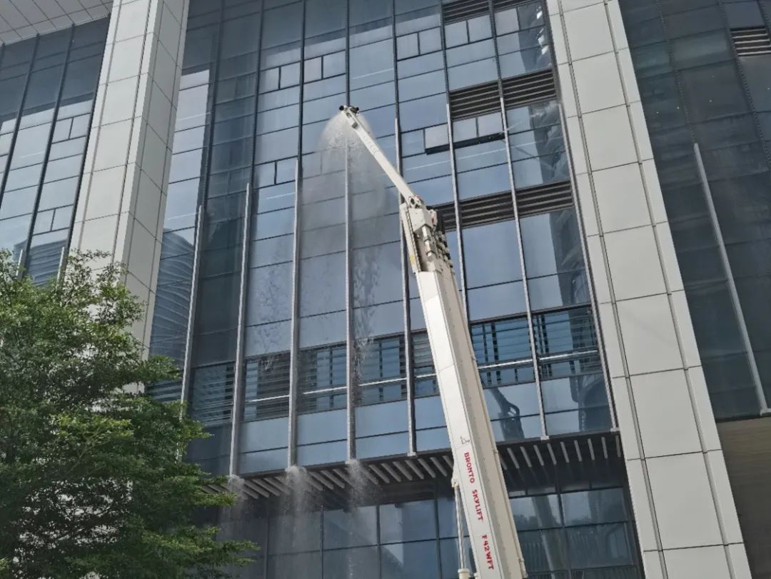 (6)橫琴消防救援大隊(duì)——使用高空水泡消防車對(duì)現(xiàn)場(chǎng)失火樓層位置進(jìn)行高空噴水;橫琴消防救援大隊(duì)與滅火行動(dòng)組里應(yīng)外合,形成合圍之勢(shì),將“火災(zāi)現(xiàn)場(chǎng)”進(jìn)行處置;