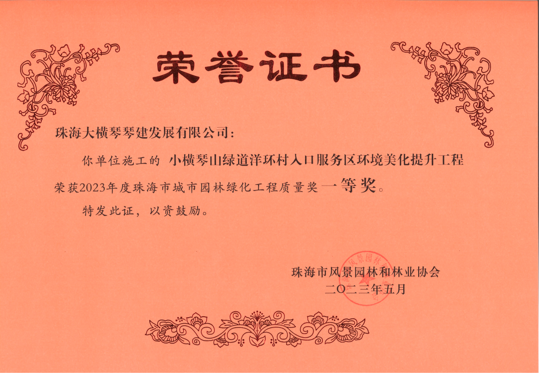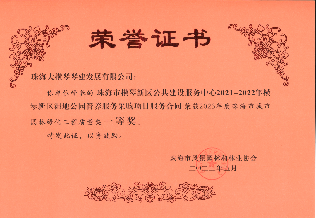 近日,珠海大橫琴琴建發(fā)展有限公司、珠海市橫琴新區(qū)公共建設服務中心,2021-2022年橫琴新區(qū)濕地公園管養(yǎng)服務采購項目服務合同,小橫琴山綠道洋環(huán)村入口服務區(qū),環(huán)境美化提升工程,以及作為代建單位負責建設的古樹名木公園(粗沙環(huán))項目,榮獲由珠海市風景園林和林業(yè)協(xié)會頒發(fā)的2023年度珠海市城市園林綠化工程質量獎一等獎。