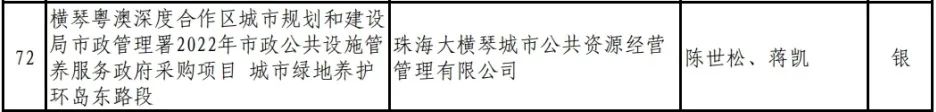 喜訊,2023年度,廣東省風(fēng)景園林與生態(tài)景觀協(xié)會(huì)科學(xué)技術(shù)獎(jiǎng)(園林工程獎(jiǎng))評(píng)選日前落幕,珠海大橫琴城市公共資源經(jīng)營管理有限公司(以下簡稱大橫琴城資)管養(yǎng)的橫琴粵澳深度合作區(qū)城市規(guī)劃和建設(shè)局市政管理署2022年市政公共設(shè)施管養(yǎng)服務(wù)政府采購項(xiàng)目——城市綠地養(yǎng)護(hù)環(huán)島東路段榮獲養(yǎng)護(hù)類銀獎(jiǎng)。