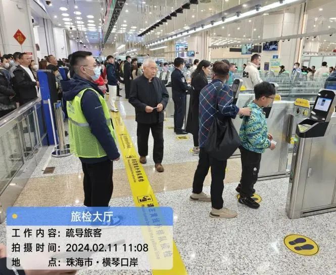 相較往年,今年春節(jié)橫琴口岸呈現(xiàn)出客流高峰提前、持續(xù)時間長、出入高峰疊加等特點(diǎn),2月11日至16日(大年初二至初七)連續(xù)6天出入單向客流均超過3萬人次。其中,2月12日(大年初三)橫琴口岸單日客流超8.2萬人次,創(chuàng)橫琴口岸成立以來歷史新高。為應(yīng)對春節(jié)期間口岸高位客流,珠海大橫琴口岸實(shí)業(yè)有限公司(下稱大橫琴口岸公司)節(jié)前召開專題會議,提前部署應(yīng)急人員、物資、設(shè)備等通關(guān)安全保障;春節(jié)期間,根據(jù)客流量變化,大橫琴口岸公司通過科學(xué)增加人力、設(shè)置蛇形緩沖通道、屏幕投放指引等措施,多管齊下加強(qiáng)出入境旅客分流引導(dǎo),防止因高客流量發(fā)生擁擠、踩踏等治安事件的發(fā)生。另外在現(xiàn)場設(shè)置“特別通道”,為老人、孕婦和殘疾人等行動不便的旅客提供便利,并設(shè)置了醫(yī)療救援,以備過關(guān)旅客有不時之需。