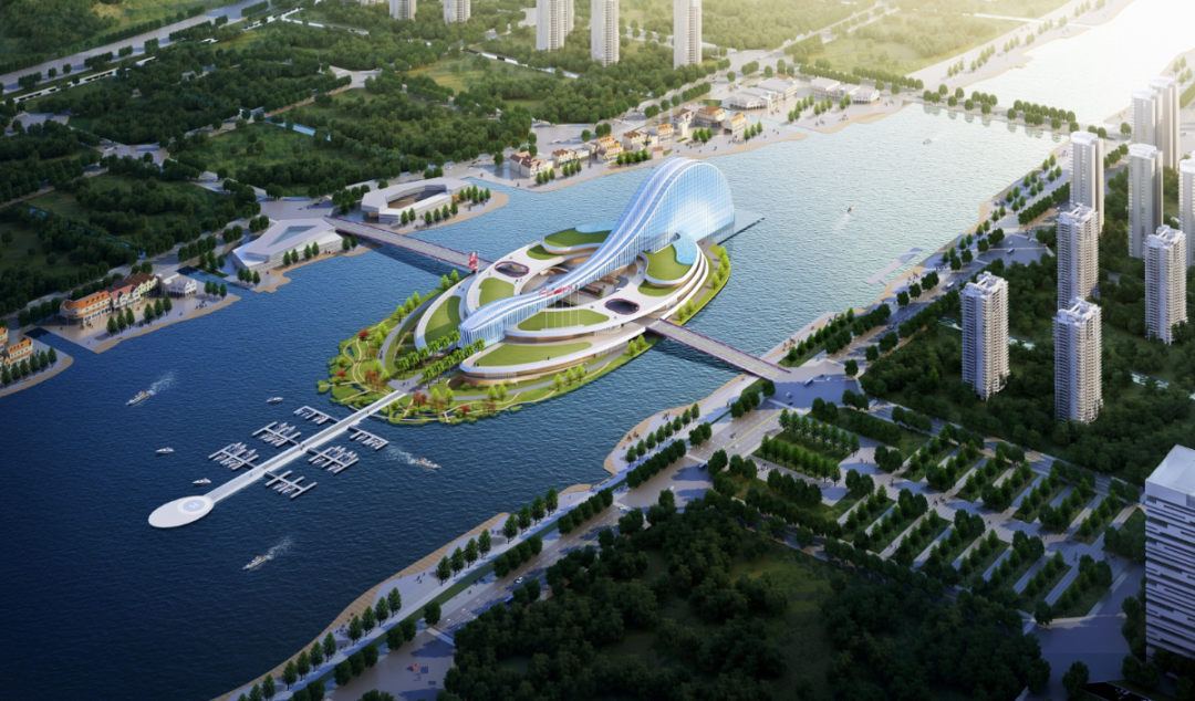 建筑、島嶼、橋梁空間互通,有機共融,打造地標性島嶼建筑,助力構(gòu)建天沐河旅游休閑帶。
