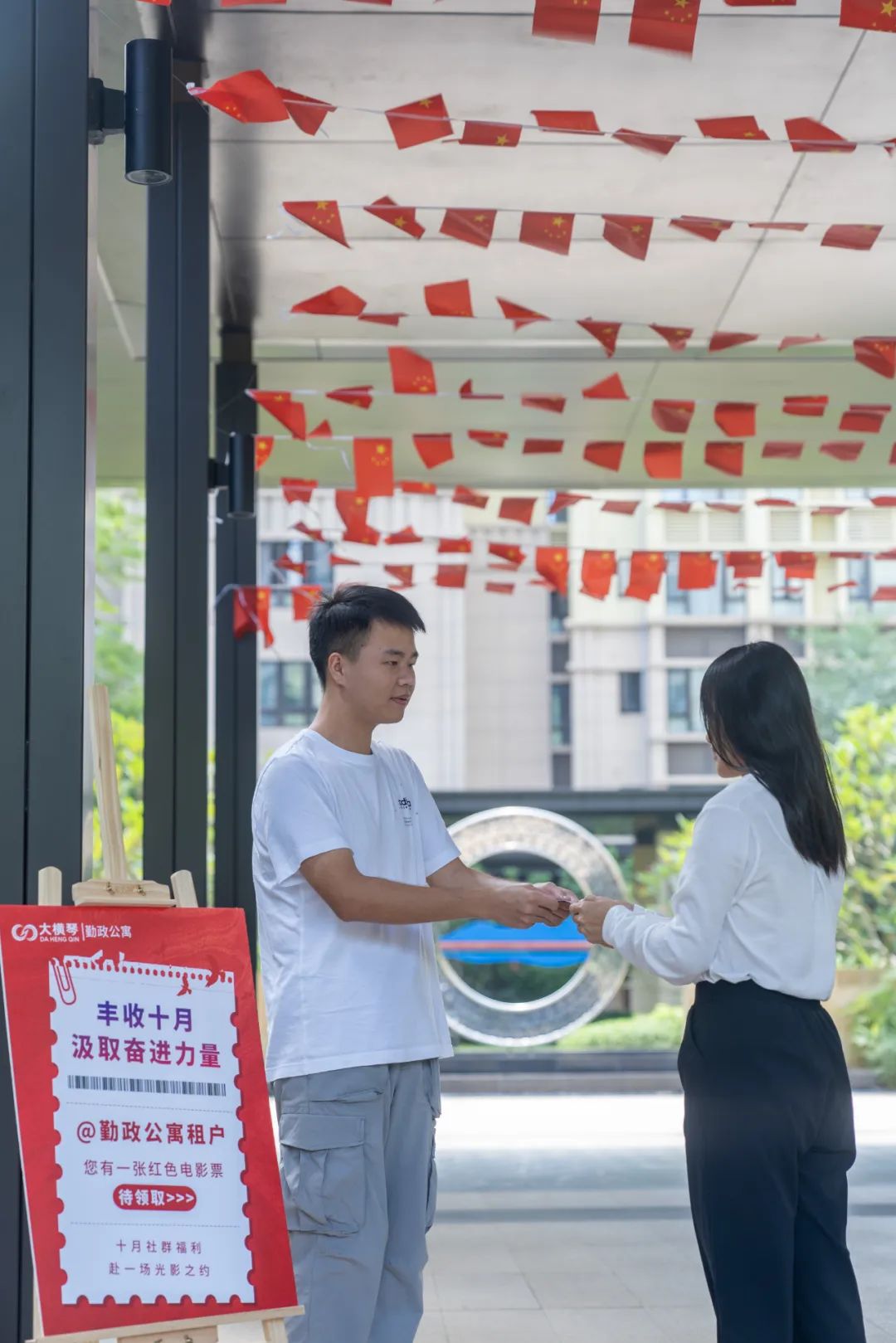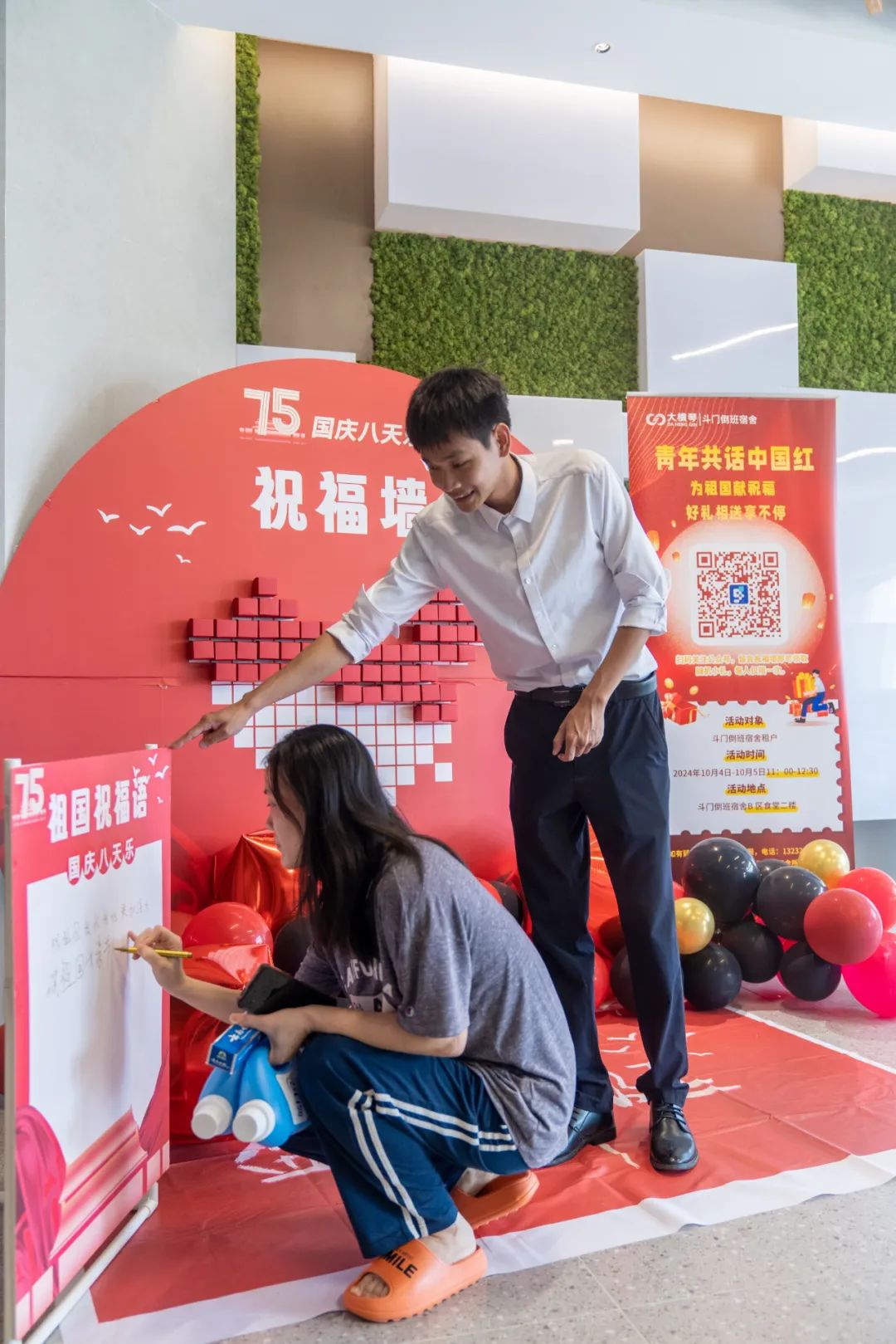 此外,大橫琴泛旅游公司也在旗下運(yùn)營(yíng)的多個(gè)公寓項(xiàng)目推出國(guó)慶特色主題活動(dòng),陪伴假期留駐的住戶們度過(guò)一個(gè)喜慶、歡樂(lè)的國(guó)慶佳節(jié)。國(guó)慶黃金周期間,勤政公寓開(kāi)展了“豐收十月 汲取奮進(jìn)力量”活動(dòng),通過(guò)播放免費(fèi)電影豐富住戶生活,傳播奮進(jìn)力量;斗門大橫琴5.0產(chǎn)業(yè)新空間倒班宿舍也開(kāi)展了 “青年共話中國(guó)紅”國(guó)慶主題抽獎(jiǎng)活動(dòng),設(shè)置留言祝福墻,以青春之言,表白祖國(guó)。