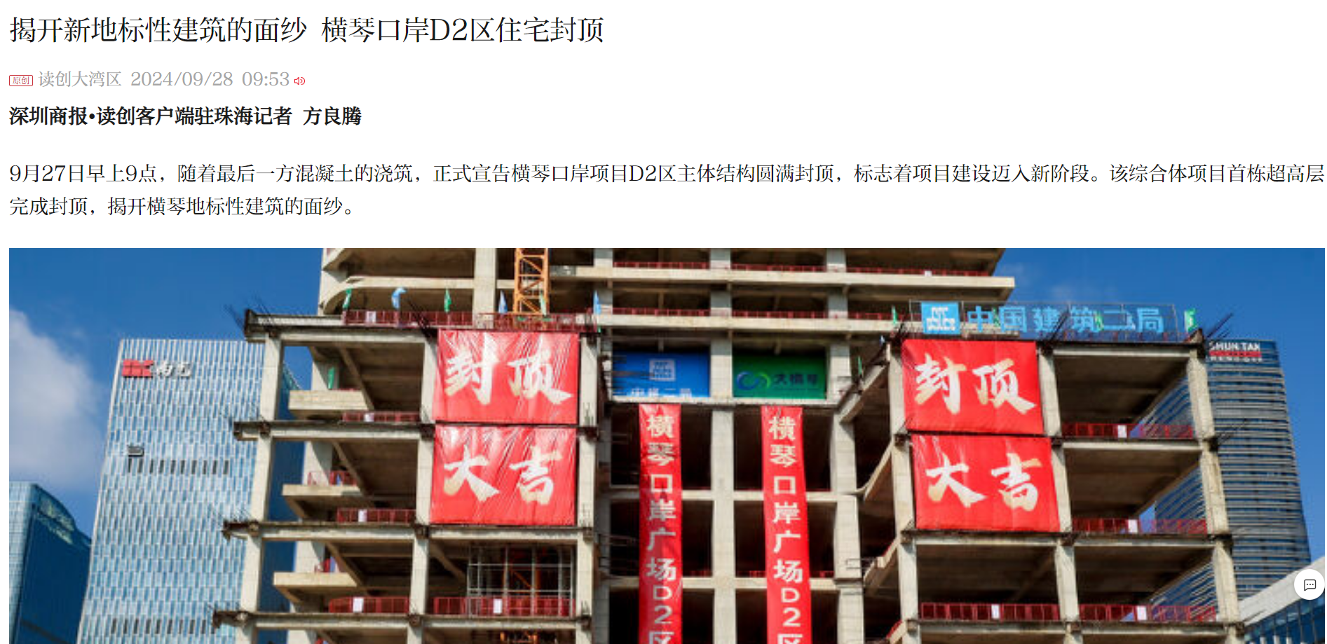 大橫琴集團(tuán)黨委副書記、董事、總經(jīng)理王宇聲,中建二局華南公司黨委書記、董事長(zhǎng)曲紅波,大橫琴集團(tuán)總經(jīng)理助理呂海濤等領(lǐng)導(dǎo)嘉賓和各參建單位代表及項(xiàng)目一線職工共100余人見證了本次封頂活動(dòng)。