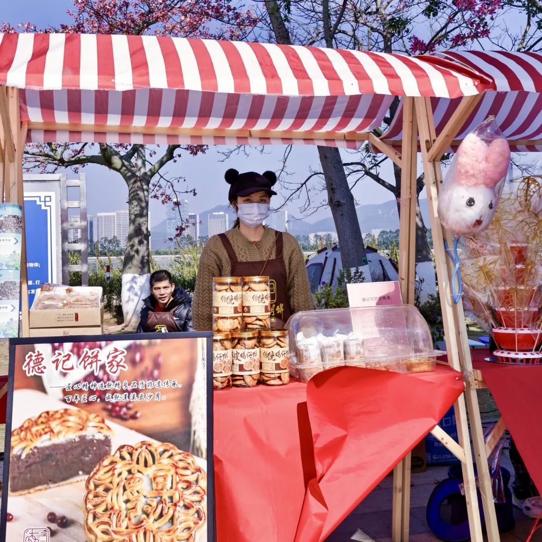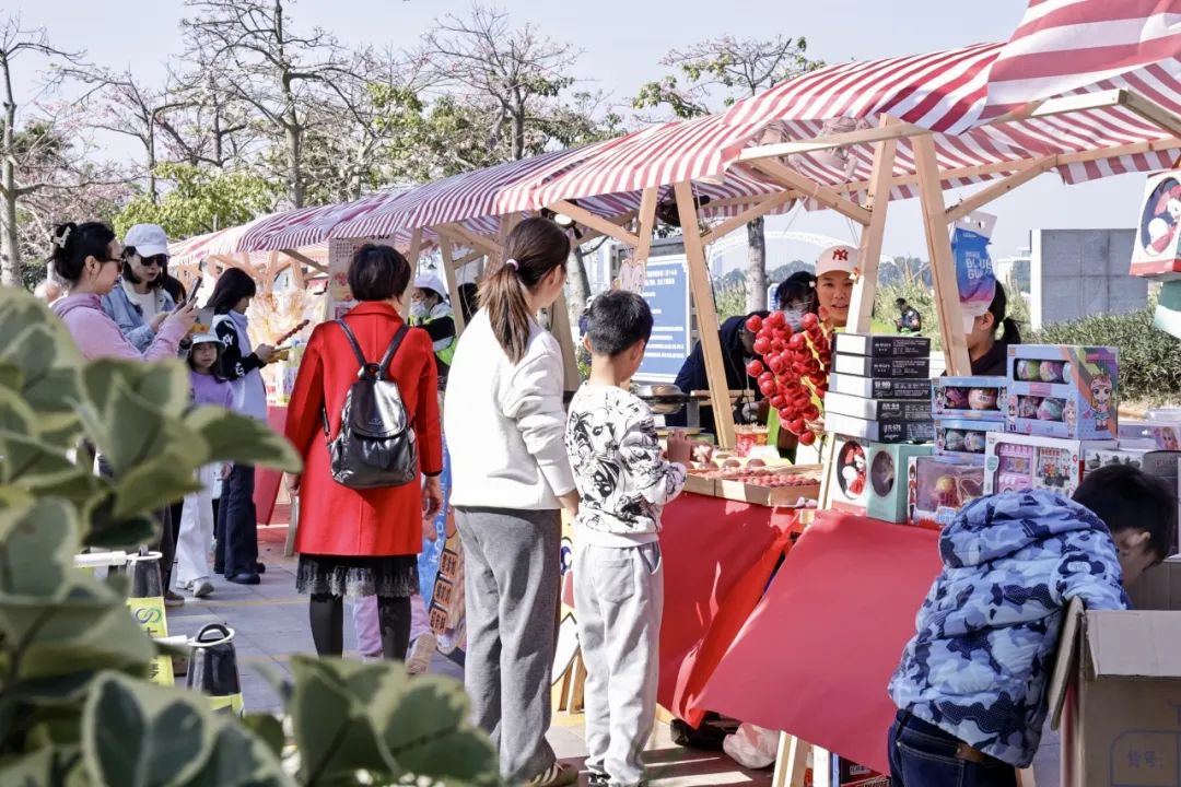 除此之外,每逢周末,一號、二號和三號驛站開展東灣墟市活動,斗門蓮洲鎮(zhèn)東灣村農產品市集走進花海,帶來優(yōu)質的本地產綠色農產品、特色手工糖水和農副產品、非遺點心小吃等,吸引了大批市民游客上前詢問和購買。游客在享受美景、體驗美食之旅的同時,亦促進了鄉(xiāng)村振興與滿足城鎮(zhèn)消費需求的良性循環(huán),鄉(xiāng)村市集在花海煥發(fā)出了新活力。