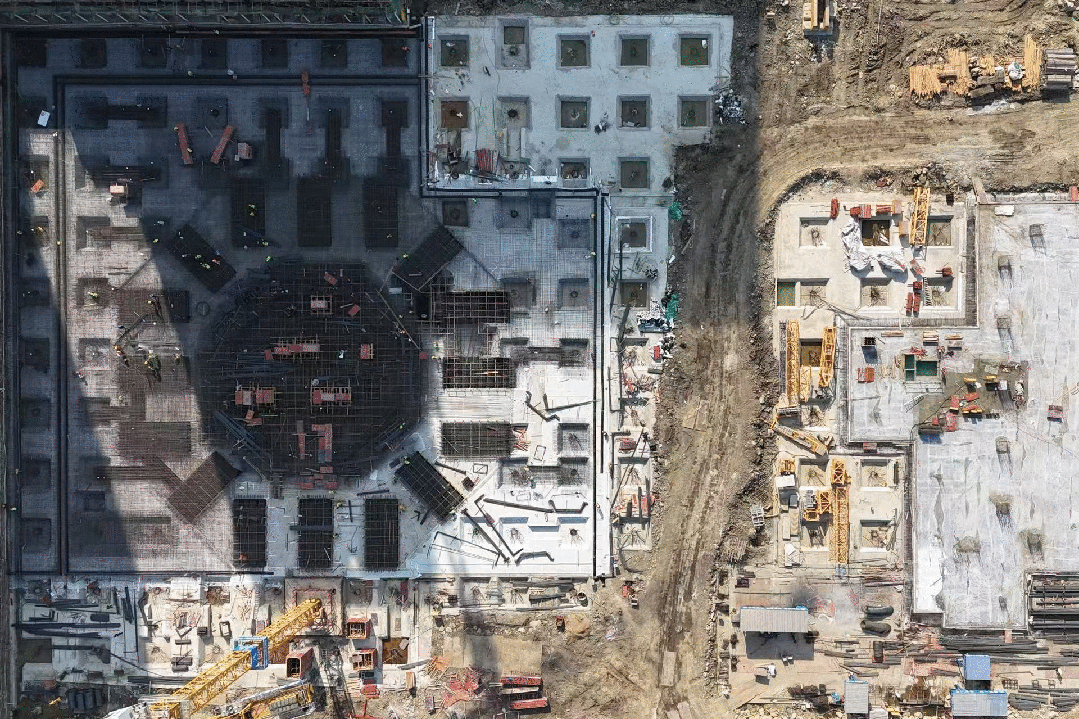 20日下午兩點,隨著一聲令下,攪拌車轟鳴著啟動,車輪滾滾,穿梭在工地道路上,卷起陣陣塵土,恰似一場盛大的工業(yè)“接力賽”拉開帷幕。一罐罐精心調(diào)配的混凝土,在泵送壓力下,如熾熱的血液,沿著輸送管道奔涌向前,精準地注入這尊“建筑巨人”的核心筒內(nèi)。施工現(xiàn)場中,上百名經(jīng)驗豐富的建筑工人分工明確,有的手持振搗棒確保漿體氣泡消散,結(jié)構(gòu)密實;有的在旁密切監(jiān)測澆筑高度,校核澆面平整,他們的專注眼神與嫻熟動作,交織成一幅熱火朝天的勞動畫卷。